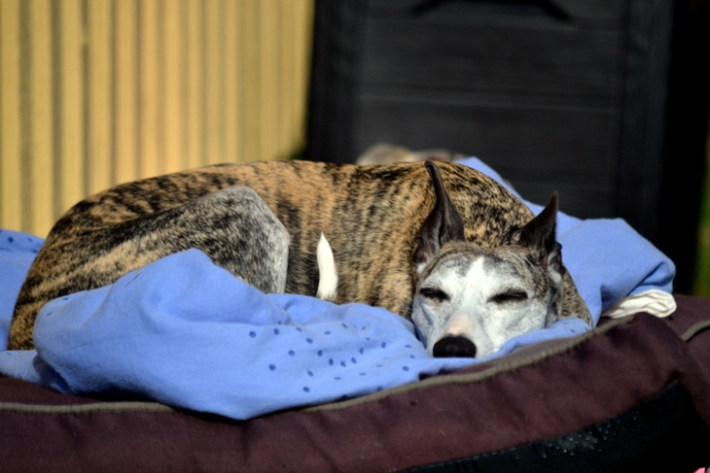 På kvällarna ligger vi i lådan tillsammans en stund innan läggdags, vi gjorde ett försök att låta Kakan sova inne i sovrummet men det tyckte hon blev för varmt så när det närmar sig flyttar någon av oss ut i hundrummet med henne.